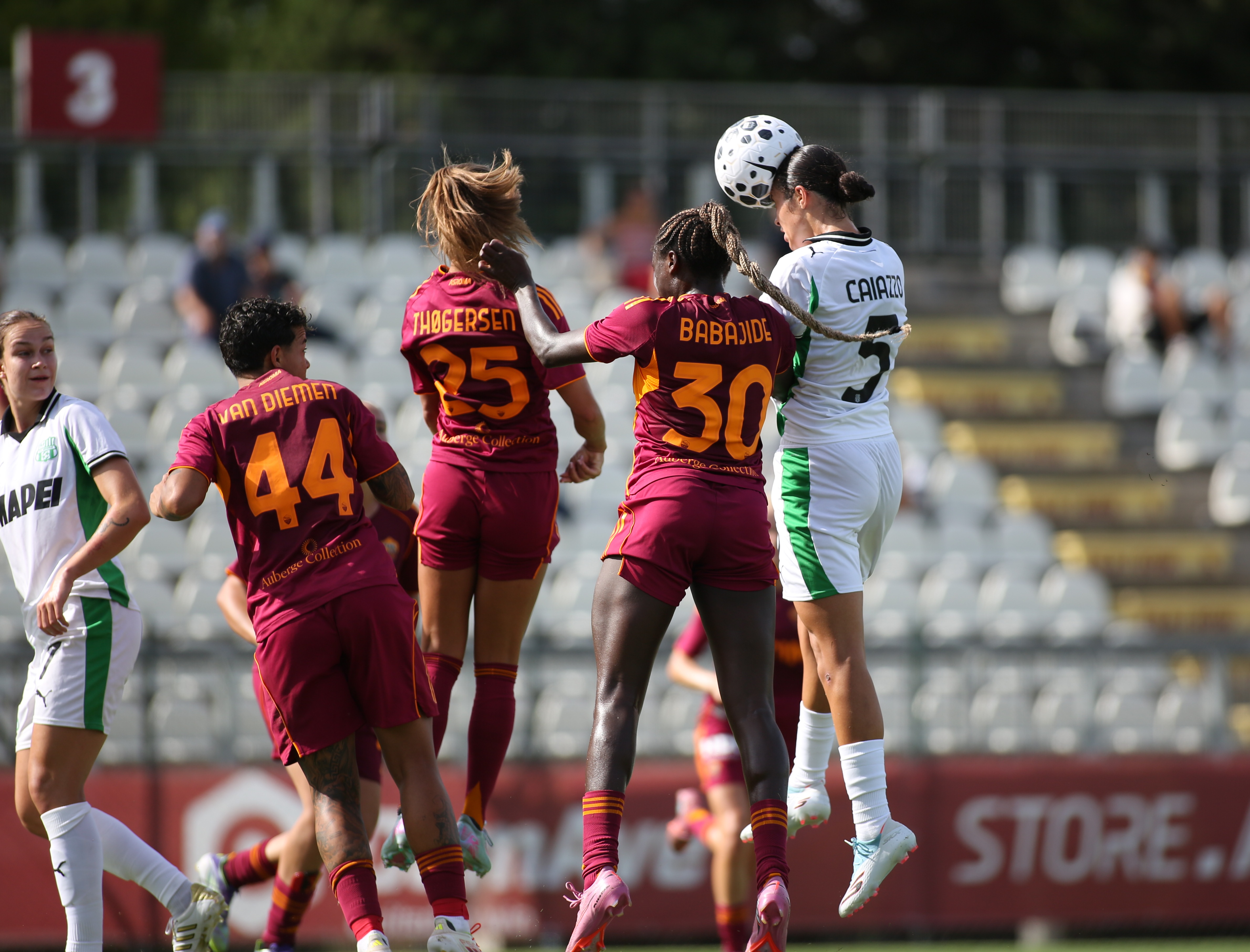 LA PARTITA. Le giallorosse tengono le redini del gioco sin dall’inizio della gara del Tre Fontane e al 21’ si portano in vantaggio con Babajide, che raccoglie il suggerimento di Greggi e con un rasoterra chirurgico pesca l’angolino vincente sul secondo palo. Il Sassuolo prova a reagire con un cross velenoso di Eto, ma Di Guglielmo è attenta e sventa il pericolo. Le neroverdi sembrano guadagnare metri e fiducia, ma allo scadere del recupero, le padrone di casa raddoppiano con Greggi, che dopo l’assist a Babajide firma la rete del 2-0 con cui si chiude la prima frazione del match. Nel secondo tempo, dopo uno spunto di Clelland neutralizzato da van Diemen, tornano a spingere le capitoline, che ci provano prima con Rieke dalla distanza e poi con la combinazione tra Kuhl e Pante, interrotta però dall’intervento sicuro di Durand.