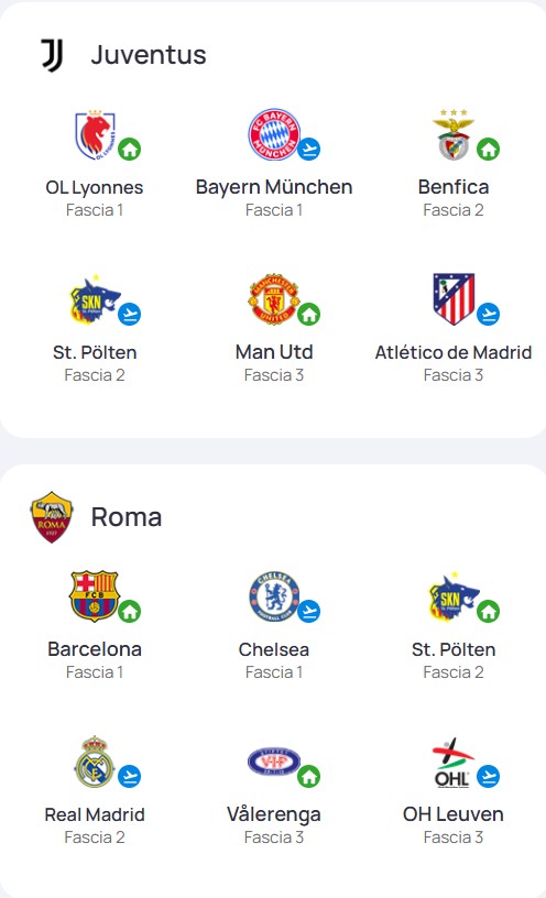 Le bianconere affronteranno anche Benfica, St. Pölten, Manchester United e Atletico Madrid, mentre la squadra di Rossettini St. Pölten, Real Madrid, Vålerenga e Leuven. Le partite della fase campionato si giocheranno tra ottobre e dicembrevenerdì 19 settembre 2025