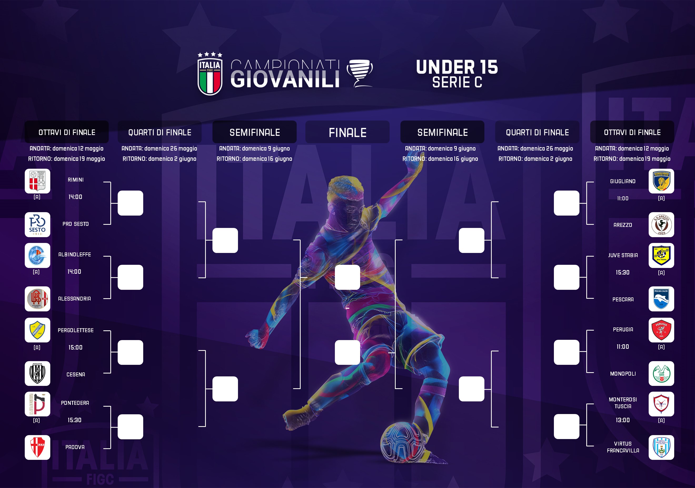 Domenica 12 maggio si entra ufficialmente nella fase decisiva dei campionati Under 16 e Under 15 di Serie C. Nel fine settimana scenderanno in campo le formazioni qualificate ai quarti di finale, per quanto riguarda la categoria Allievi, e agli ottavi del torneo riservato ai Giovanissimi: le prime tappe a eliminazione diretta per raggiungere le finali scudetto in programma a giugno. Tra le 8 gare degli ottavi Under 15, spicca la sfida tra Pontedera e Padova, con la formazione toscana, terza dietro l'Alessandria, trascinata dal bomber Vanni, 22 reti, e l'undici veneto guidato da Ottoni, che può vantare il miglior attacco dell'intera categoria, con 100 gol realizzati, e la coppia del gol Rizzo-Mazzon, autori di 42 reti in due.