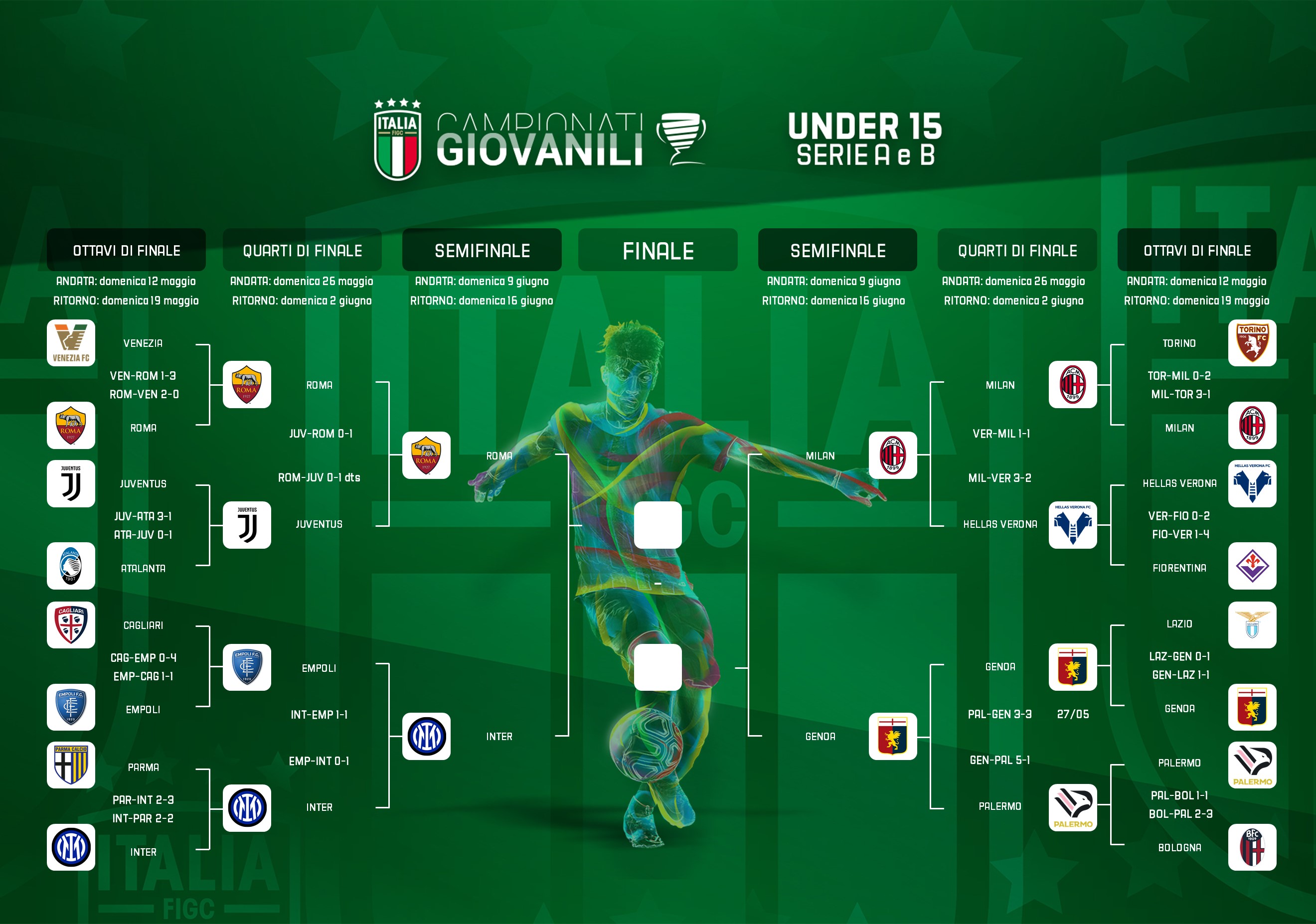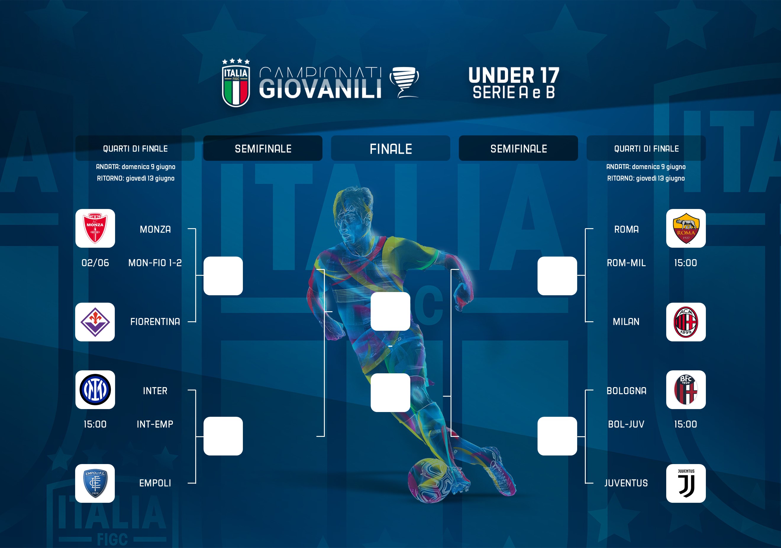 Nell'andata dei quarti di finale, la Fiorentina di Marco Capparella ha vinto 2-1 in rimonta al 'Berlusconi' con il Monza. I viola hanno incassato l'1-0 avversario, firmato da Principe, al 23' prima di ribaltare il risultato grazie alle reti realizzate da Evangelista al 36' e Pisani al 54'. In virtù della qualificazione della Nazionale Under 17 alla finale dell'Europeo, in programma mercoledì 5 giugno (ore 19.30 italiane) al Limassol Stadium di Limassol (Cipro) con il Portogallo, le seguenti partite sono state posticipate a domenica 9 giugno (ore 15): Roma-Milan, Bologna-Juventus e Inter-Empoli.