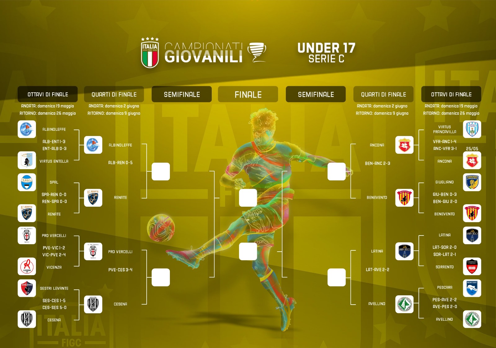 Grande prova di Virtus Entella e Cesena che nelle gare d'andata delle semifinali Under 16 di Serie C si impongono sui campi di Avellino e Benevento. Accedono alla medesima sfida del campionato Under 15 Pro Sesto, Pergolettese, Arezzo e Virtus Francavilla, dopo aver superato le rispettive avversarie negli ottavi di finale. Nel torneo Under 17, notevole prova del Renate nell'andata dei quarti con il 5-0 imposto all'Albinoleffe.