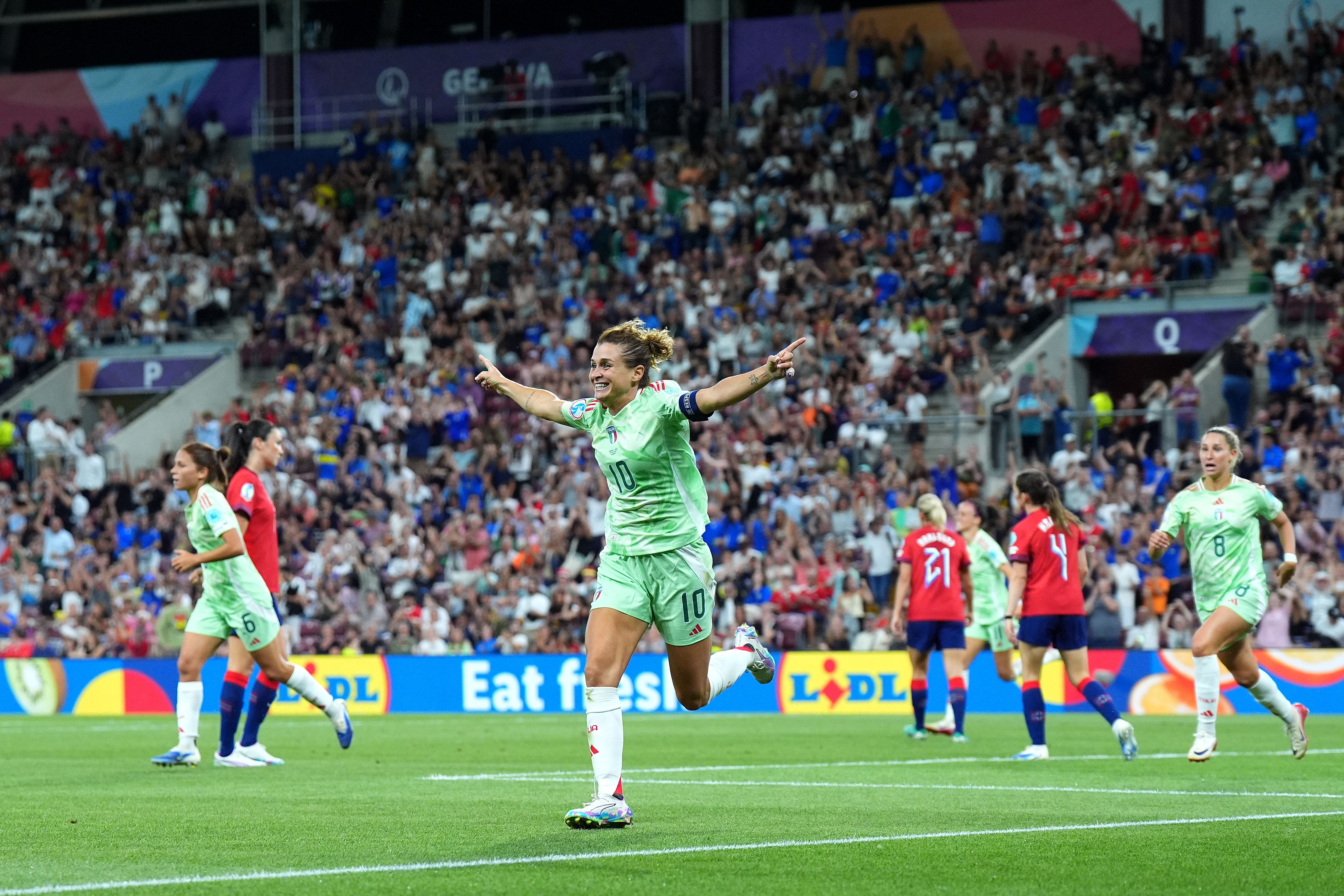 L’Italia, seguita nella vittoria ai quarti con la Norvegia da 2 milioni e 371mila telespettatori, sogna di rivivere un’altra notte magica allo Stade de Genève, il palcoscenico preferito da Cristiana Girelli che lì ha realizzato la rete meravigliosa con il Portogallo e la doppietta che ha permesso alla squadra di raggiungere il penultimo atto della competizione dopo 28 anni di attesa. Con le sue tre perle l’attaccante della Juventus, diventata la calciatrice più anziana a segnare una marcatura multipla in un Europeo, è seconda nella classifica dei gol del torneo alle spalle della spagnola Gonzalez Rodriguez (a quota tre anche Alexia Putellas), in campo stasera a Berna nella semifinale contro le padrone di casa della Svizzera (domani l'ultimo quarto tra Francia e Germania).
