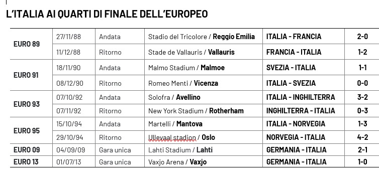 L’Italia torna ai quarti di finale dell’Europeo dopo 12 anni, per la settima volta nella competizione: quattro di fila tra il 1989 e il 1995 (dopo aver raggiunto la semifinale nel 1984 e nel 1987 direttamente dal girone di qualificazione), quando il turno si giocava in doppia sfida andata e ritorno, con tre qualificazioni contro Francia (’89), Svezia (’91) e Inghilterra (‘93) e un’eliminazione, proprio con la Norvegia (’95); poi altre due presenze ai quarti nel 2009 e il 2013, con due ko di misura con la Germania (1-2 a Lahti e 0-1 a Vaxjo). Il bilancio complessivo ai quarti dell’Europeo è dunque di tre qualificazioni e tre eliminazioni. In totale, contando le doppie gare, 10 partite disputate, quattro vittorie, due pareggi e quattro sconfitte, 15-14 il conto dei gol.
