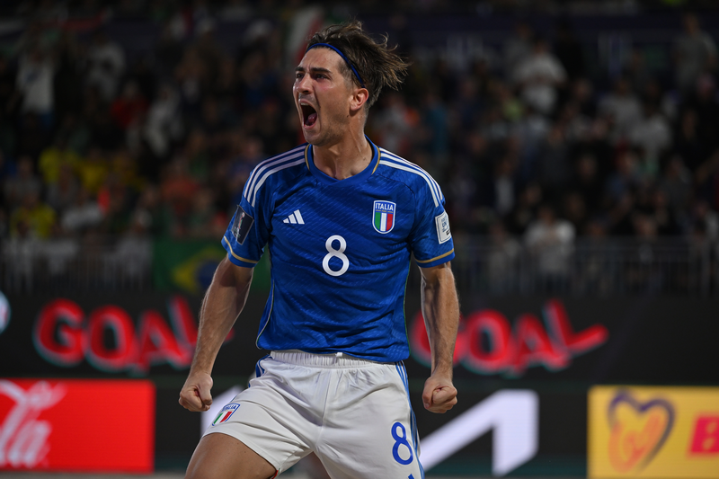 LA PARTITA. In partenza Del Duca varia ancora il quintetto di partenza, con Caspieri in porta ci sono Josep e Bertacca, Fazzini da equilibratore e Sciacca in punta. L’Italia approccia la partita alla grande, sfrontata, senza paura e dopo 4’ la sblocca: sul lancio di Casapieri è Ale Remedi ad alzarsi in rovesciata, Bobo fa un miracolo deviando sulla traversa e sul tap-in Genovali apre il piattone per l’1-0. La risposta del Brasile non si fa attendere con Rodrigo, il miglior giocatore al mondo, che sposta palla e calcia col destro: solo un super Casapieri, che devia in angolo, dice di no all’1-1. Ancora i verdeoro vanno vicini al pareggio, sempre col loro numero 9, ma il destro spizza il palo esterno alla sinistra di Casapieri. Sul campo è grande battaglia su ogni pallone: a 20’’ dal primo intervallo Rodrigo, sempre lui, trova un tiro che s’impenna sulla sabbia scavalcando Casapieri per l’1-1.