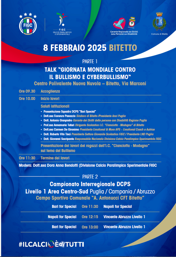 Ci saranno, tra gli altri, il sindaco di Bitetto, Fiorenza Pascazio, il Garante dei Diritti delle persone con Disabilità per la Regione Puglia, Antonio Gianpietro, il presidente del Settore Giovanile Scolastico della FIGC (e presidente della Lega Nazionale Dilettanti Puglia), Roberto Vito Tisci, e il responsabile nazionale della Divisione Calcio Paralimpico Sperimentale della FIGC, Giovanni Sacripante.
