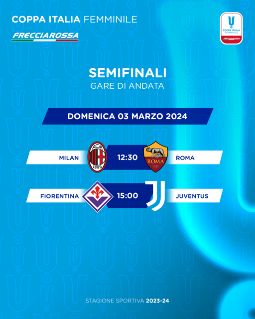 Le grandi protagoniste delle ultime edizioni della competizione sono pronte a dar vita ai primi 90’ delle semifinali della Coppa Italia Frecciarossa. Da una parte Milan-Roma, che avevano dato vita alla finale del 2021 e alla semifinale dello scorso anno (le giallorosse ebbero la meglio in entrambi i casi), dall’altra Fiorentina-Juventus, con le viola a caccia del titolo conquistato nel 2018 e le bianconere intenzionate a riportare a Torino il trofeo vinto nel 2022 e nel 2023. Domenica il programma si aprirà alle ore 12.30 dallo stadio ‘Vismara’ di Milano, alle 15 i riflettori si sposteranno sul ‘Viola Park’ di Firenze: entrambi i match saranno trasmessi in diretta sul canale Youtube della FIGC Femminile.