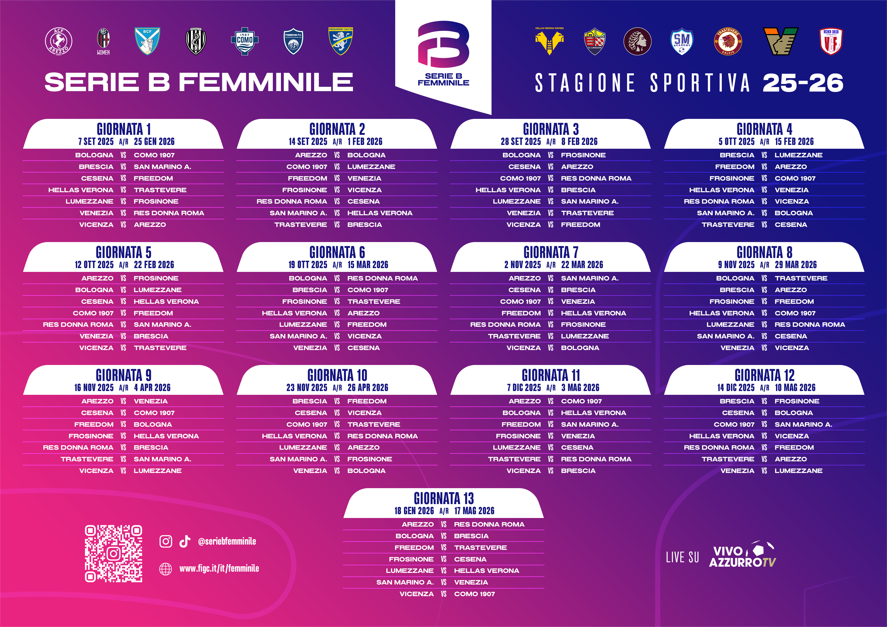 Anche per la stagione 25-26, sarà Vivo Azzurro TV - la piattaforma OTT della Federazione disponibile App Store, Google Play e Smart Tv, e sul web al sito www.vivoazzurrotv.it - a trasmettere tutte le partite: la grande novità è rappresentata dall'anticipo al sabato di una partita per turno. Un 'match of the week' ogni settimana, a partire da quello di sabato 6 settembre tra il Bologna - quarto al termine della passata stagione - e il Como 1907. Brescia-San Marino Academy, Cesena-Freedom, Verona-Trastevere, Lumezzane-Frosinone, Venezia-Res Donna Roma e Vicenza-ACF Arezzo le altre partite della prima giornata.