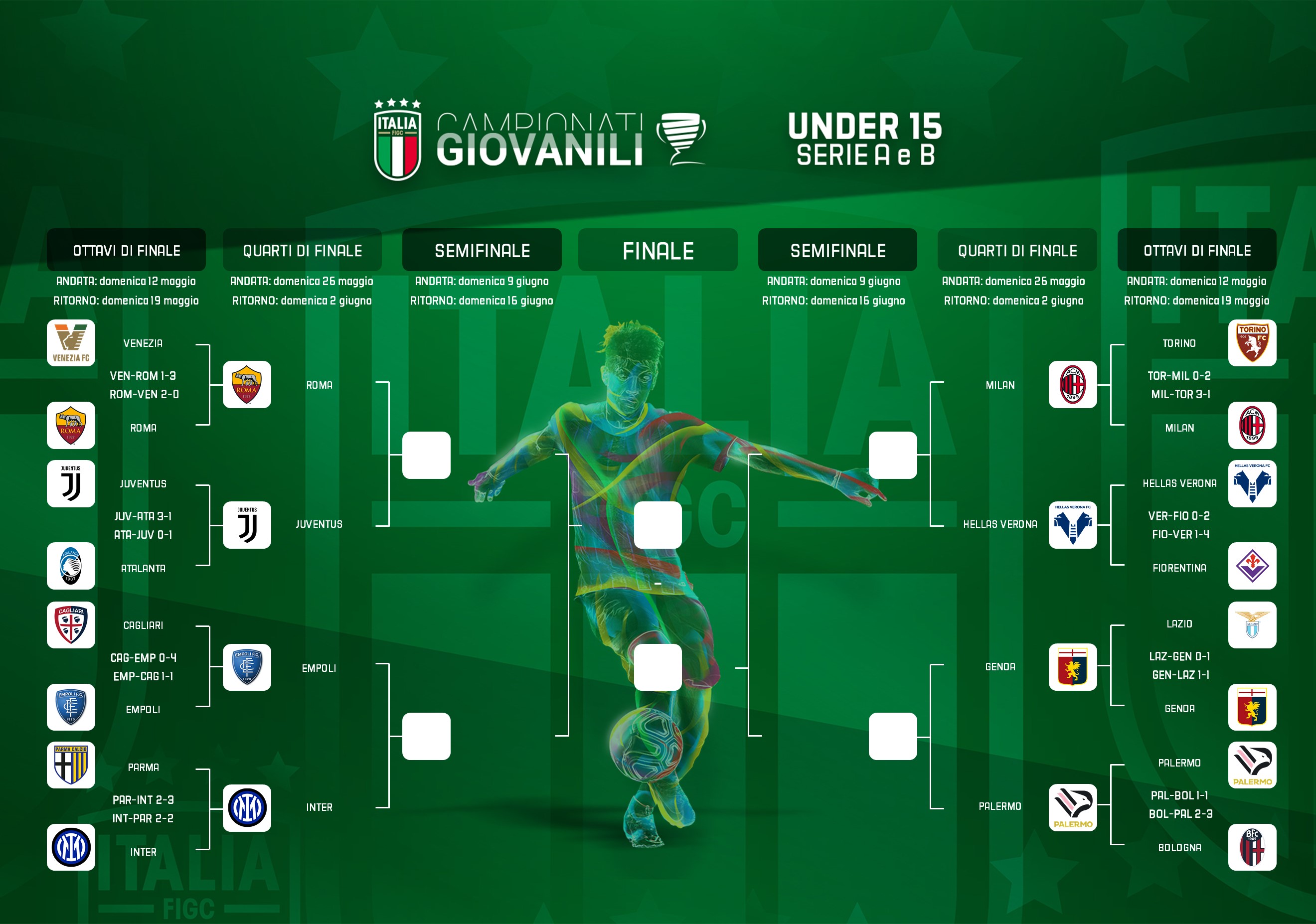 I rosanero, dopo aver incassato le reti rossoblù di Andolina e Fustini nel primo tempo, ribaltano il risultato nella ripresa grazie alla doppietta del classe 2010 Pipitò e al gol di La Corte. Completati i quadri dei quarti di finale Under 16 e 15Monday, May 20, 2024
