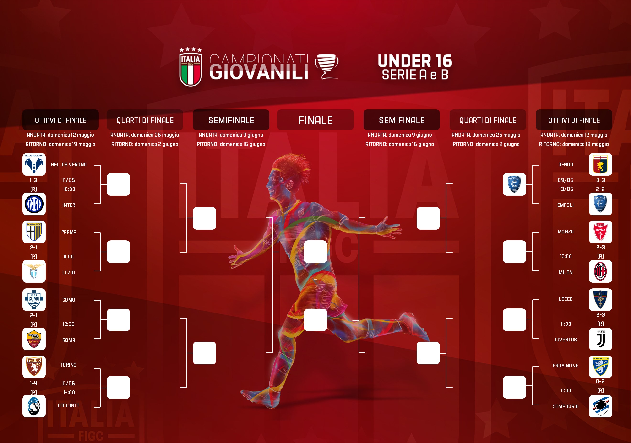 Nelle altre partite, la Roma di Mattia Scala, che ha vinto 3-1 in trasferta una settimana fa, ospiterà a Trigoria il Venezia, così come il Milan di Roberto Bertuzzo farà gli onori di casa al Torino dopo essersi imposto 2-0 al 'Vismara' nella gara di andata. Impegni casalinghi anche per Genoa, Inter, Fiorentina e Atalanta, che proveranno a consolidare i successi dell'andata con Lazio, Parma, Hellas Verona e Juventus. Per concludere, il Cagliari di Federico Trodu, in scena fuori casa a Vinci, proverà nella difficile impresa di ribaltare il 4-0 incassato all'andata dall'Empoli.