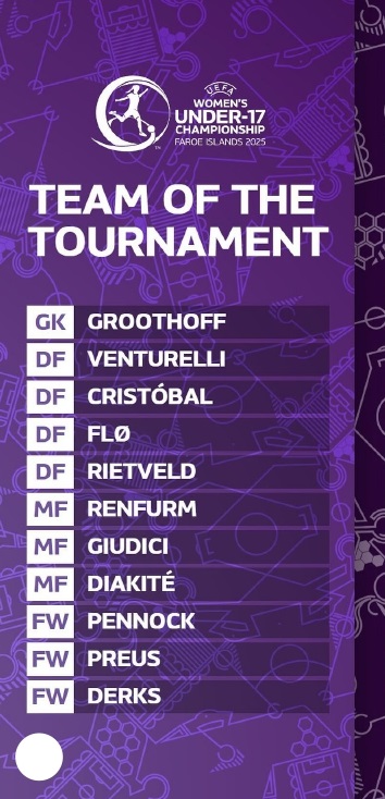 A conferma delle ottime prestazioni delle Azzurrine, ben due giocatrici italiane sono state inserite dalla UEFA nell’undici ideale della manifestazione. Si tratta della capitana, Caterina Venturelli (nell'immagine di copertina, ndr), che ha disputato il torneo da terzino destro, e della centrocampista Rachele Giudici. Nella formazione ideale dell’Europeo figurano cinque calciatrici dei Paesi Bassi, che hanno trionfato nel torneo. L’Italia è la seconda squadra più rappresentata (con due calciatrici), insieme alla Norvegia, l’altra finalista della manifestazione.