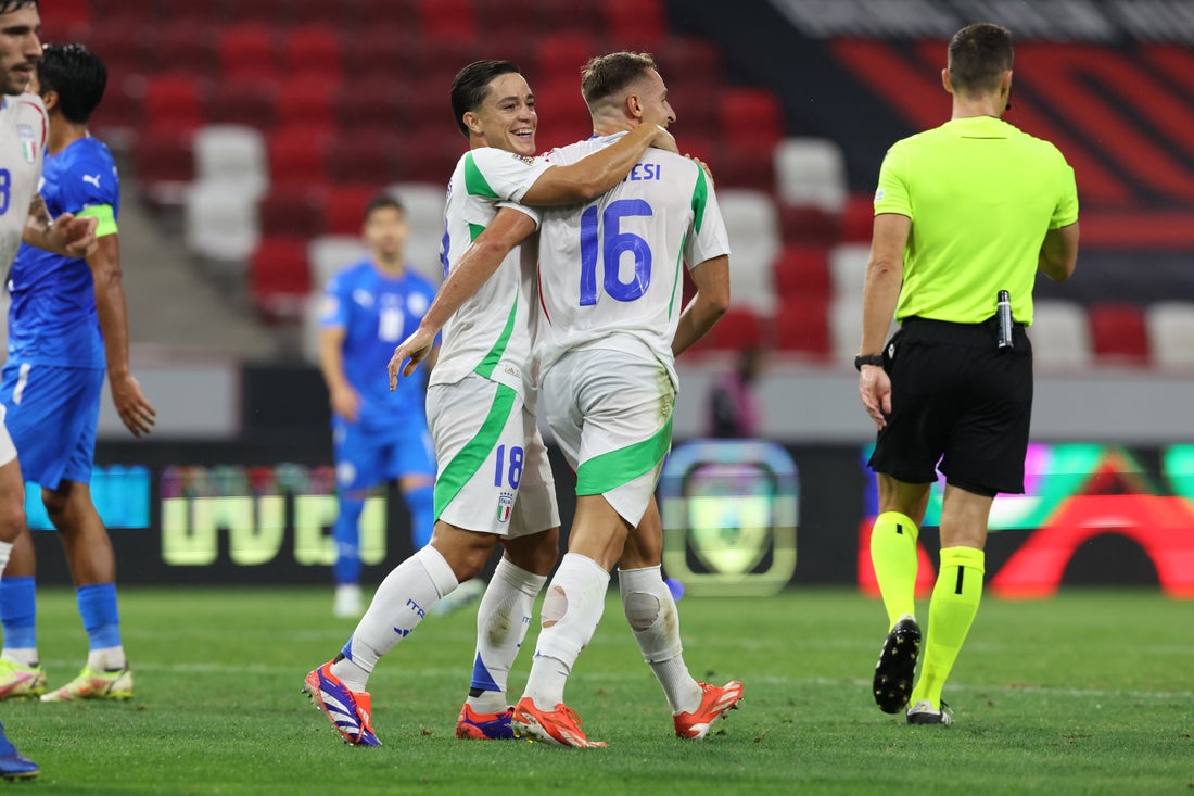 ITALIA (3-5-2): Donnarumma; Gatti, Bastoni, Buongiorno; Bellanova (dal 18’st Cambiaso), Frattesi, Ricci (dal 41’st Zaccagni), Tonali, Dimarco (dal 25’st Udogie); Raspadori (dal 18’st Brescianini), Kean (dal 41’st Retegui). A disp: Vicario, Meret, Okoli, Di Lorenzo, Fagioli, Pellegrini. Ct: Spalletti.