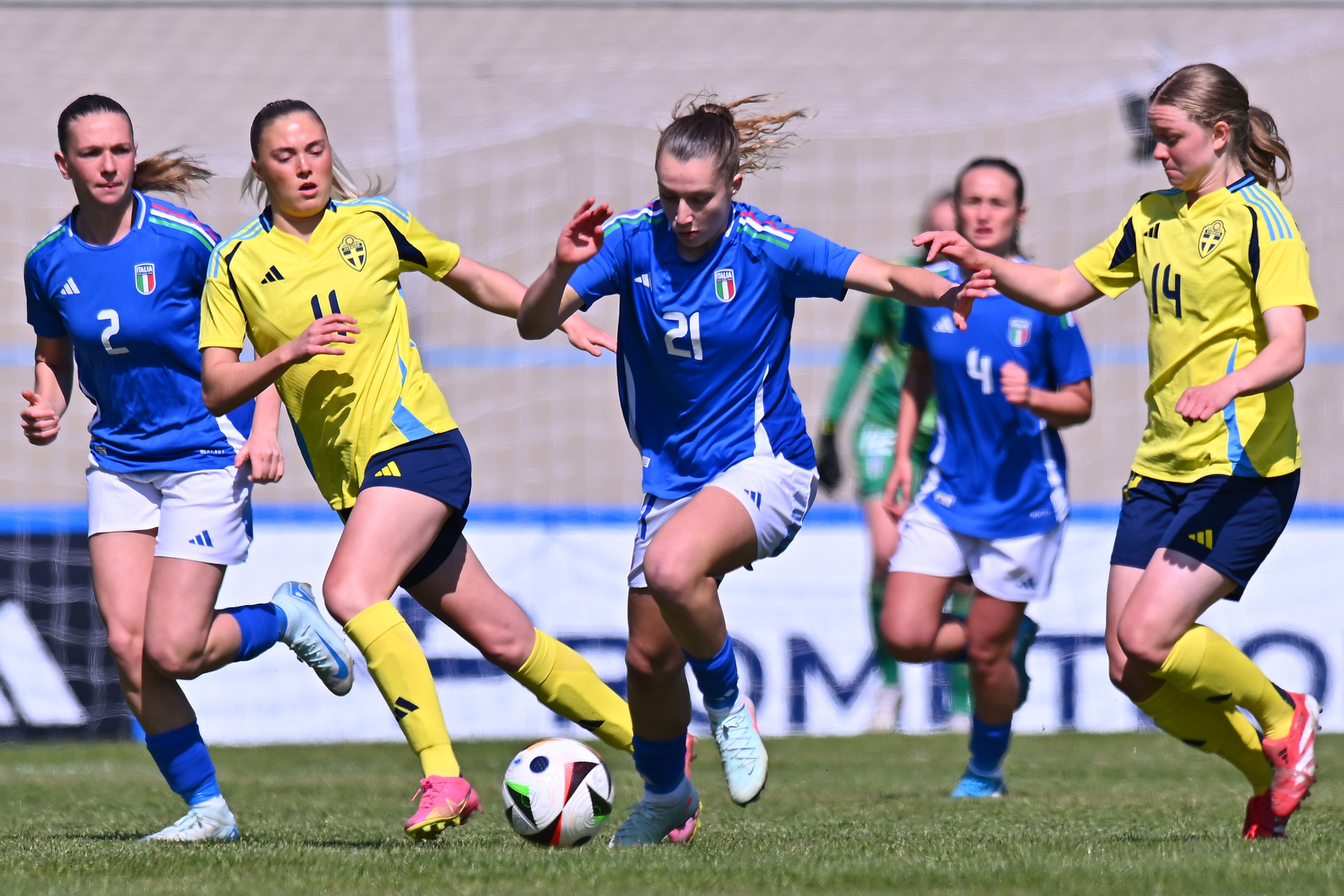 La partita è più che mai viva ed equilibrata, con le Azzurrine che gestiscono maggiormente possesso palla e manovre offensive, e la Svezia che si affaccia pericolosamente dalle parti di Belli quando può in contropiede. La superiorità fisica delle scandinave impone grande cautela per evitare facili calci piazzati per le avversarie, anche se proprio da una punizione, al 36’, nasce un’azione molto pericolosa per la Svezia, con Schroder che però non riesce a dare precisione e potenza alla sua conclusione di testa, facile preda del portiere azzurro.
