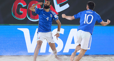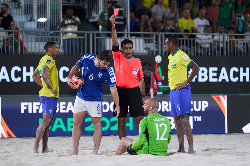 LA PARTITA. In partenza Del Duca varia ancora il quintetto di partenza, con Caspieri in porta ci sono Josep e Bertacca, Fazzini da equilibratore e Sciacca in punta. L’Italia approccia la partita alla grande, sfrontata, senza paura e dopo 4’ la sblocca: sul lancio di Casapieri è Ale Remedi ad alzarsi in rovesciata, Bobo fa un miracolo deviando sulla traversa e sul tap-in Genovali apre il piattone per l’1-0. La risposta del Brasile non si fa attendere con Rodrigo, il miglior giocatore al mondo, che sposta palla e calcia col destro: solo un super Casapieri, che devia in angolo, dice di no all’1-1. Ancora i verdeoro vanno vicini al pareggio, sempre col loro numero 9, ma il destro spizza il palo esterno alla sinistra di Casapieri. Sul campo è grande battaglia su ogni pallone: a 20’’ dal primo intervallo Rodrigo, sempre lui, trova un tiro che s’impenna sulla sabbia scavalcando Casapieri per l’1-1.