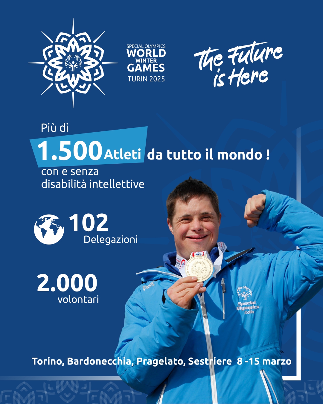 'The Future is Here', il futuro è qui: questo il 'claim' dei Giochi Mondiali Invernali 'Special Olympics', che da domani fino al 15 marzo vedranno la partecipazione di 1500 atleti, con e senza disabilità intellettive, provenienti da 100 Paesi, in 8 diverse discipline: sci alpino, sci nordico, danza sportiva, pattinaggio artistico, floorball, snowboarding, corsa con le racchette da neve, pattinaggio di velocità. Le gare si svolgeranno a Torino, Bardonecchia, Sestriere e Pragelato.